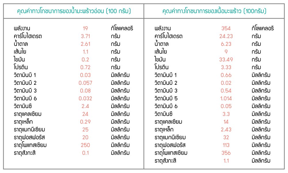 ส่วนจาวมะพร้าวพบ mannan นอกจากนี้ในน้ำมะพร้าวในเนื้อมะพร้าวยังมีคุณค่าทางโภชนาการ ดังนี้