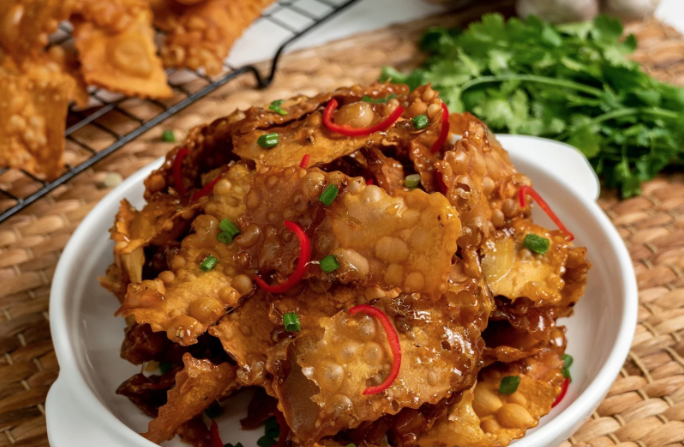 “เกี๊ยวกรอบเค็ม” ดัดแปลงมาจากขนมไทยโบราณอย่าง “กรอบเค็ม” แต่เปลี่ยนมาใช้ แผ่นเกี๊ยวที่นำไปทอดจนกรอบ