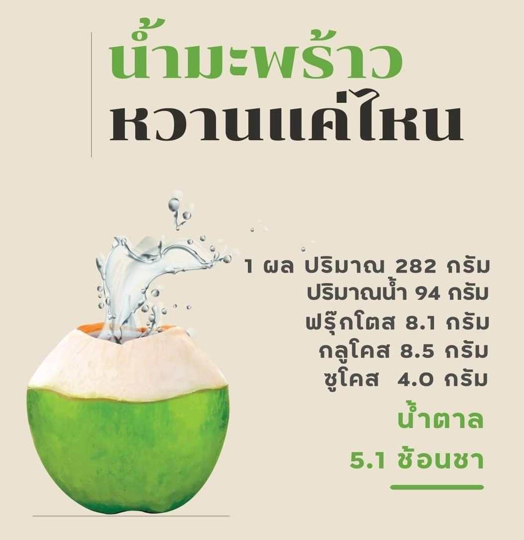 แพทย์หญิงธิดากานต์ รุจิพัฒนกุล หรือ หมอผิง ผู้เชี่ยวชาญด้านผิวพรรณและเวชศาสตร์ชะลอวัย โรงพยาบาลสมิติเวช สุขุมวิท ระบุว่า “น้ำมะพร้าวมีประโยชน์ เป็นเครื่องดื่มเกลือแร่ให้พลังงานตามธรรมชาติ แต่จัดว่าน้ำตาลสูง แม้จะเป็นน้ำตาลธรรมชาติ แต่ดื่มมากไปก็อ้วนได้เช่นกัน” โดยน้ำมะพร้าว 1 ลูก ปริมาณ 282 กรัม มีปริมาณน้ำ 94 กรัม น้ำตาลฟรุกโตส 8.1 กรัม น้ำตาลกลูโคส 8.5 กรัม น้ำตาลซูโครส 4.0 กรัม รวมเท่ากับน้ำตาลถึง 5.1 ช้อนชาเลยทีเดียว